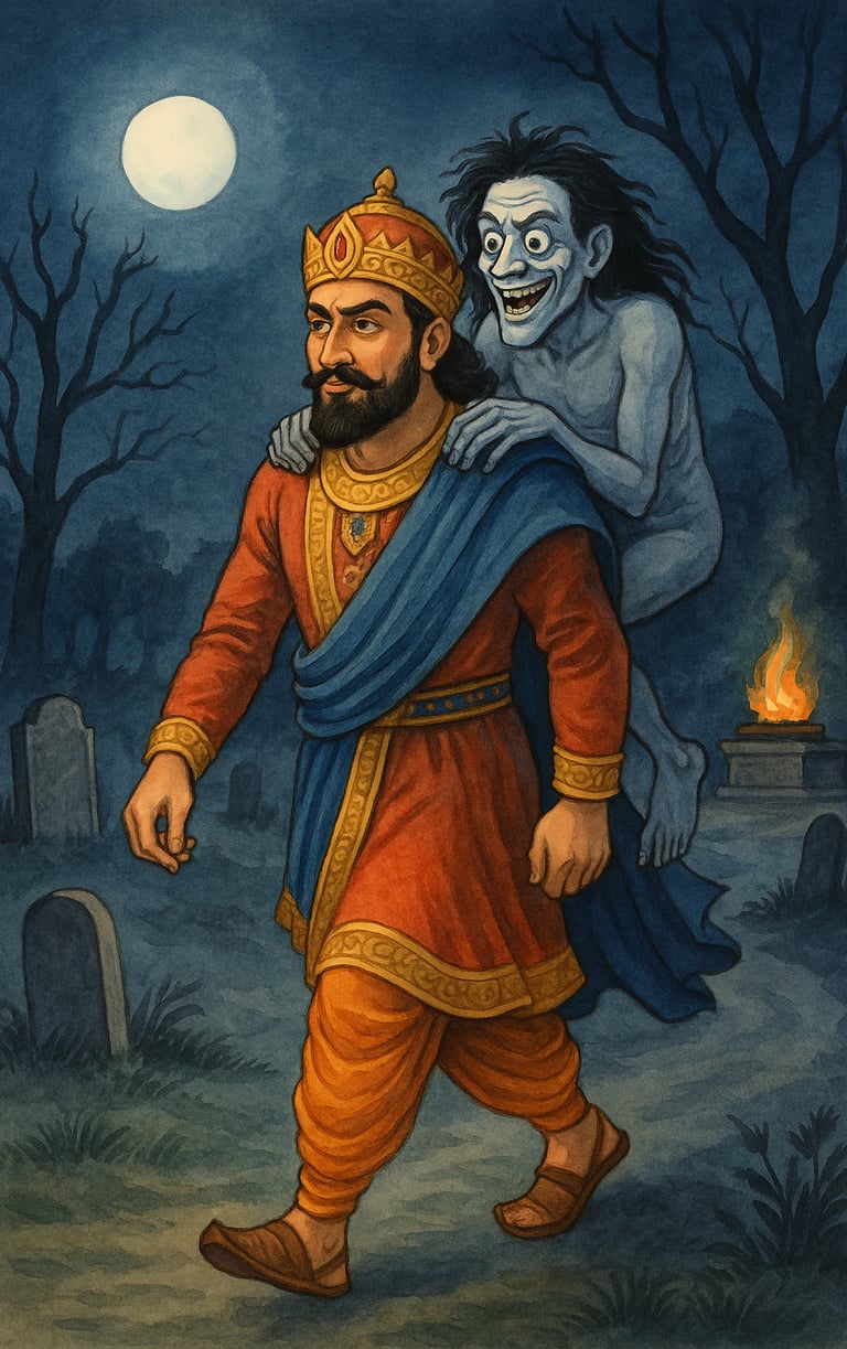 “సరే రాజా! నీ సమాధానం సత్యమే. కానీ నువ్వు మాట్లాడావు కాబట్టి నేను మళ్లీ శ్మశానవాటికకు వెళ్ళిపోతాను.”